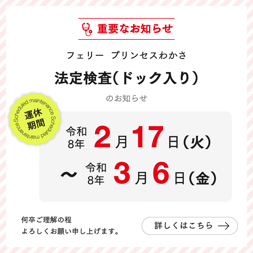 フェリー「プリンセスわかさ」法定検査(ドック入り)のお知らせ